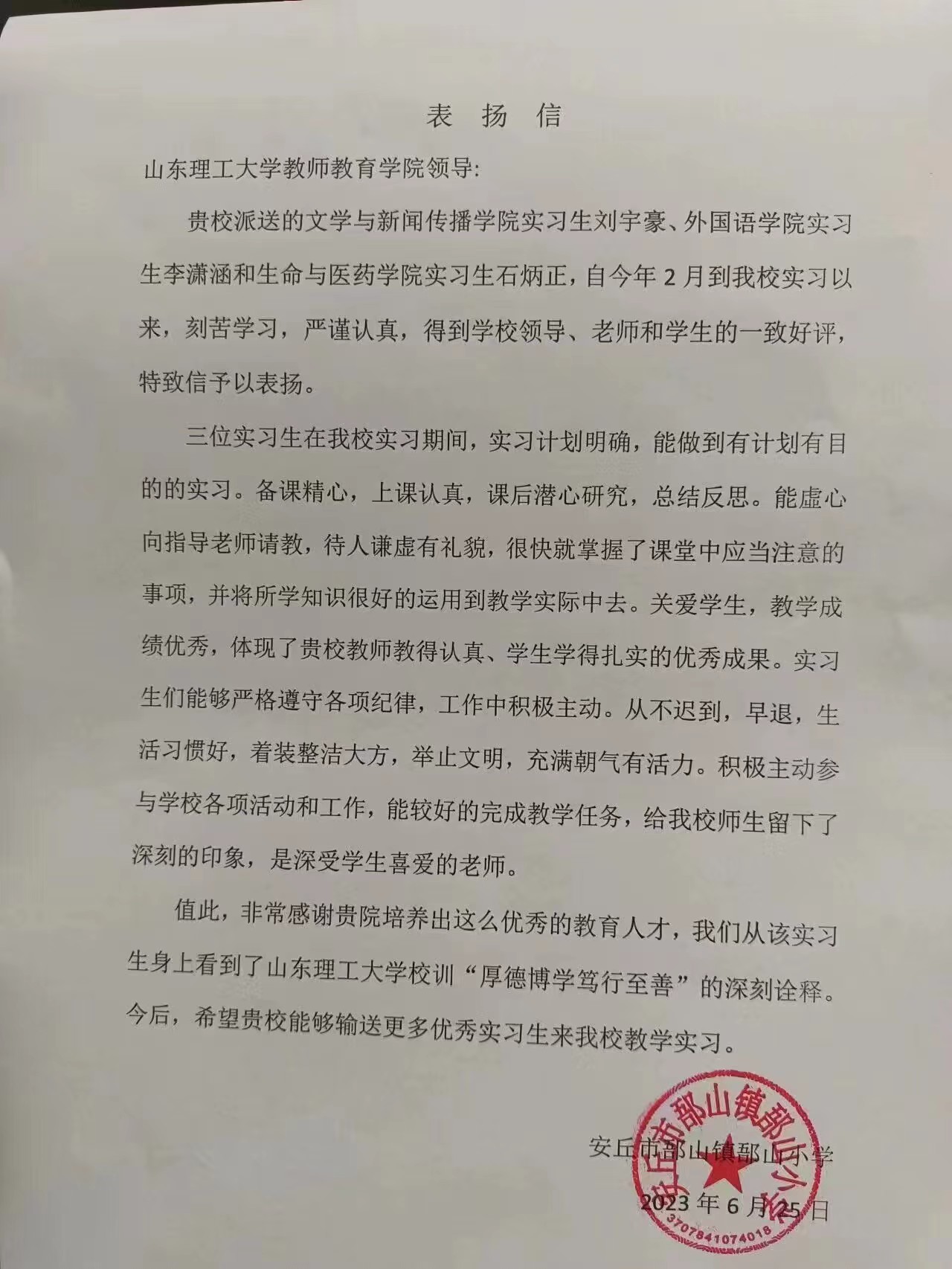 安丘市郚山镇郚山小学表扬信-刘宇豪(文学)、李潇涵(英语)和石炳正(生物)