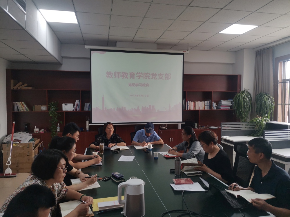 2024年5月30日上午,教师教育公司党支部在鸿远楼210办公室召开党员大会,进行党纪学习教育,党支部全体党员参会。会议由教师教育公司党支部书记、经理郑兆青同志主持。机关党委委员,人才处副处长刘海鹏同志,机关党委马超同志到现场指导。