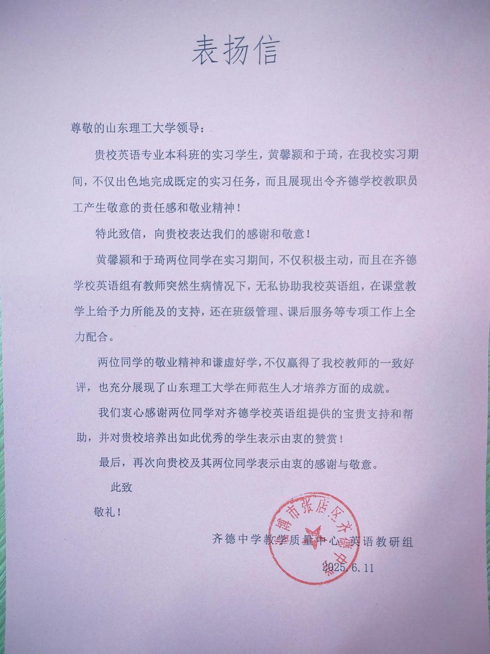 齐德中学表扬信-黄馨颍和于琦(英语)